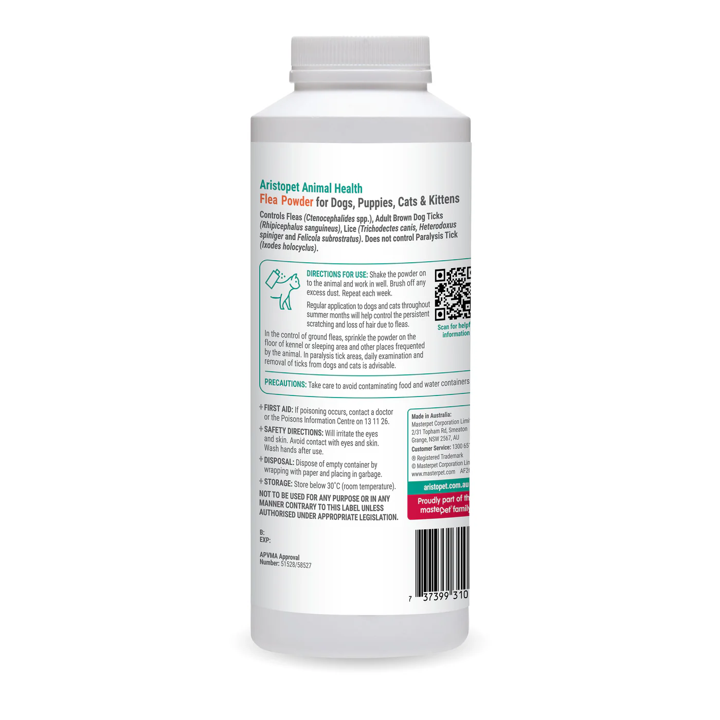 Safe and effective flea, tick, and lice control for dogs and cats. Aristopet Flea Powder is formulated to control fleas, adult brown ticks, and lice on dogs, cats, puppies, and kittens. It also helps manage environmental flea problems by treating kennels, bedding, and resting areas. Gentle and effective, this powder provides reliable relief from scratching and discomfort during Australia’s warmer months when parasites thrive.