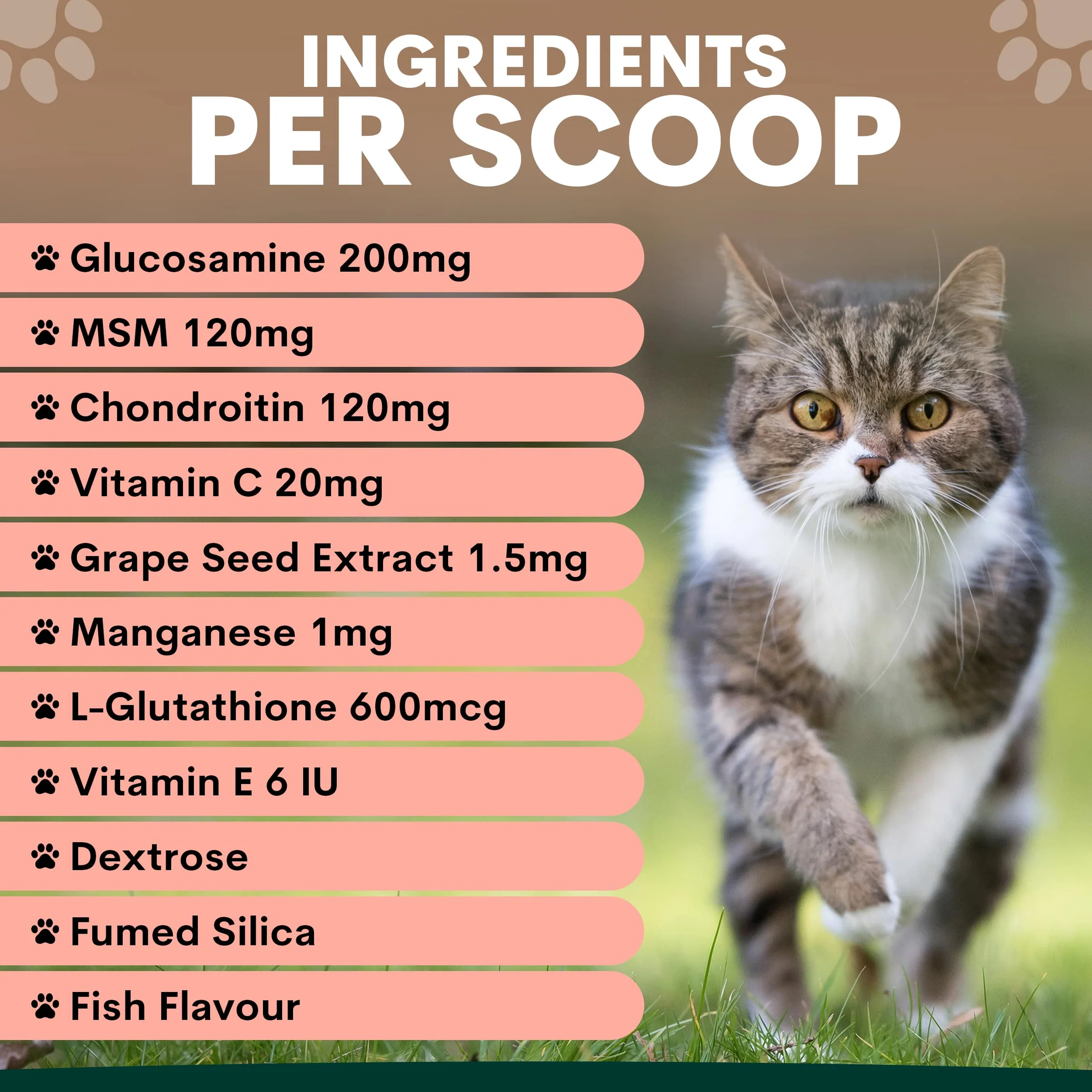Joint tissue naturally changes over time, especially in senior cats or cats with previous injury. Reduced cartilage support and inflammation can affect movement, jumping ability, and overall activity. Nutrients such as glucosamine and chondroitin are commonly included in joint care routines to help maintain normal joint structure and comfort.