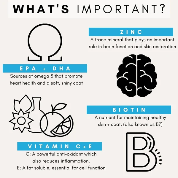 - Biotin (20mcg): Promotes hair growth, coat density, and nail strength.