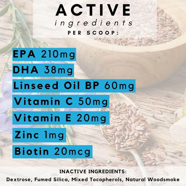 - Linseed Oil (60mg): A natural source of plant-based Omega 3 to enhance coat texture.