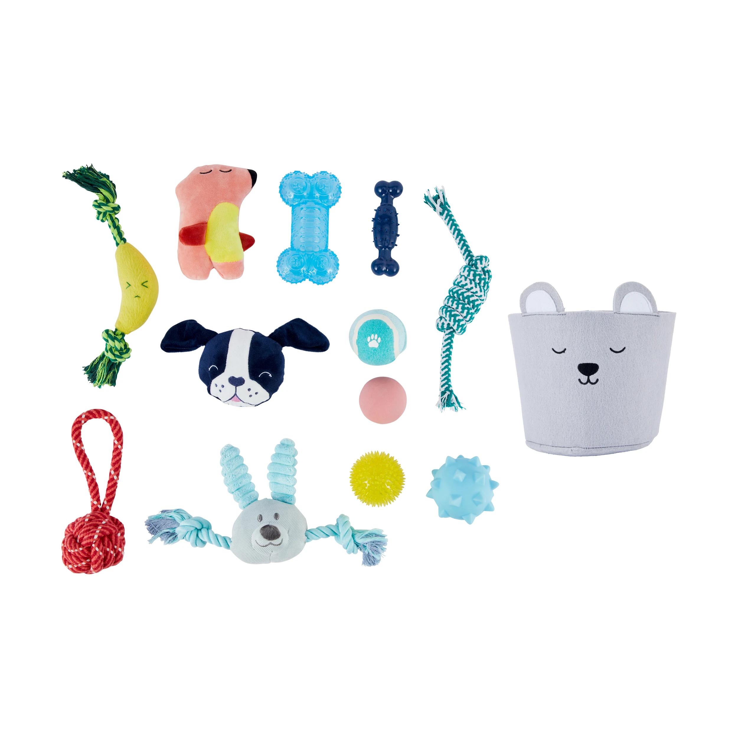 - Includes 1 x storage bucket, 1 x tennis ball, 1 x bouncy ball, 2 x spiky ball, 1 x treat bone, 1 x rubber bone, 1 x bunny plush rope and squeaker, 1 x banana plush rope and squeaker, 1 x puppy plush and squeaker, 1 x bear plush and squeaker, 1 x knotted rope and 1 x rope knot with handle