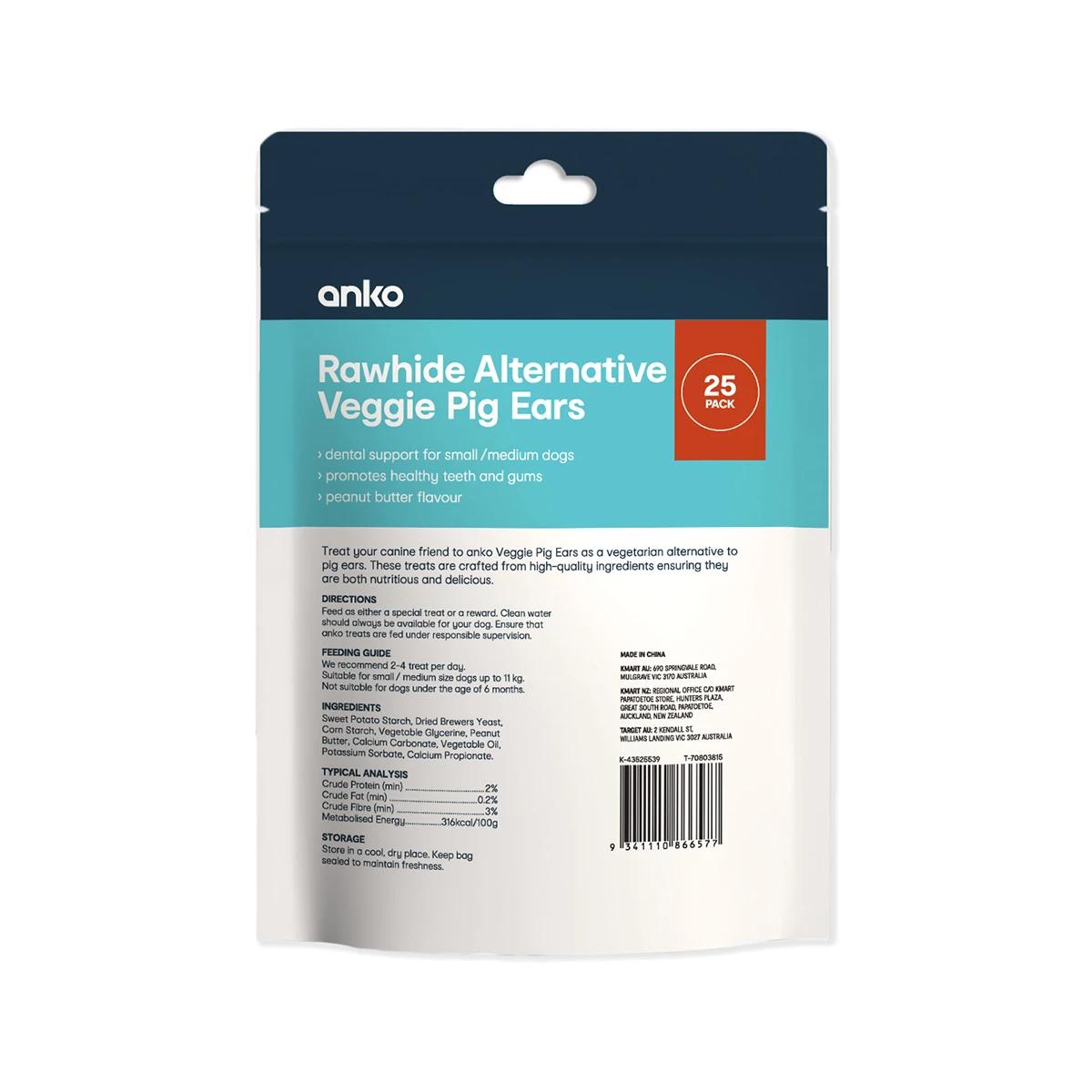 Treat your dog to the best with Anko Veggie Pig Ears and watch their tail wag with joy.Product Details25 packIngredients: Sweet Potato Starch, Dried Brewers Yeast, Corn Starch, Vegetable Glycerine, Peanut Butter, Calcium Carbonate, Vegetable Oil, Potassium Sorbate, PropionateFeaturesDental support for small/medium dogsPromotes healthy teeth and gumsPeanut butter flavourAdditional InformationNote:Store in a cool, dry place. Keep bag sealed to maintain freshness.Pet food only.Feed as either a special treat or a reward. Clean fresh water should always be available for your dog. Ensure that Anko treats are fed under responsible supervision.