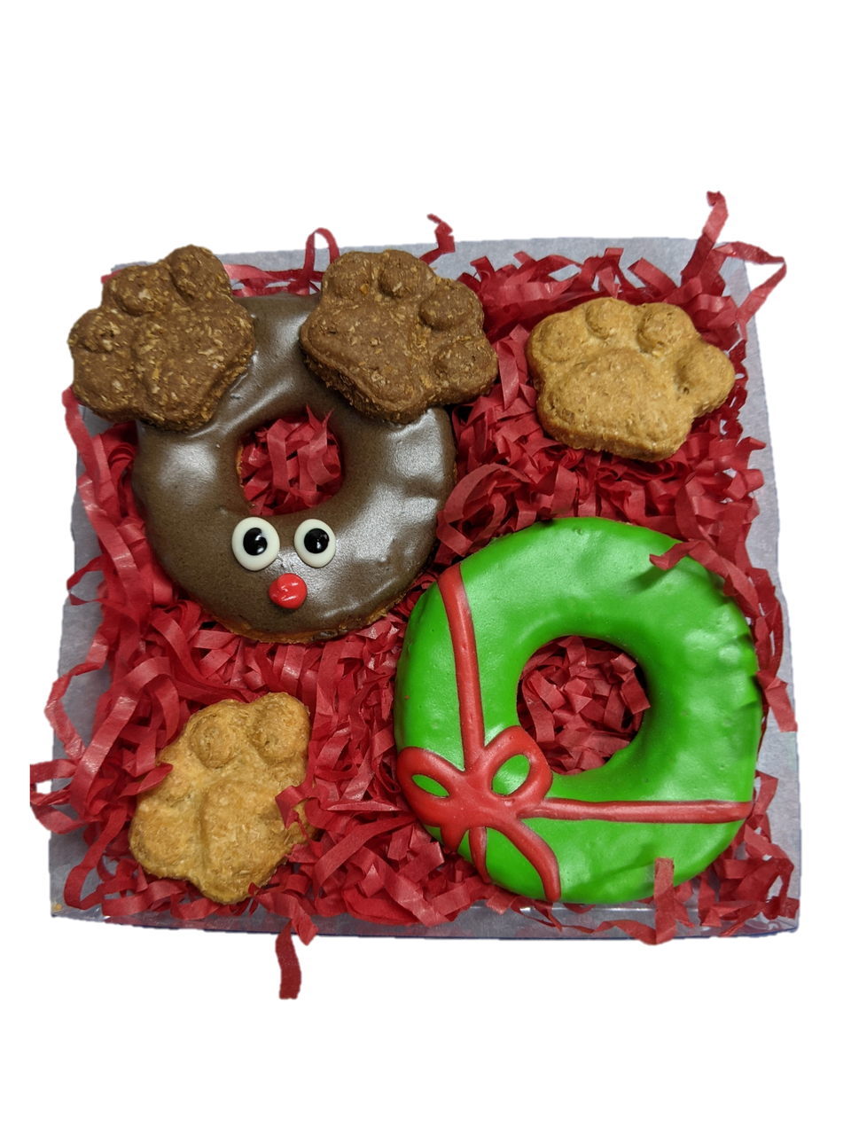 - 2 Big Doggy Donuts – One decorated like a festive present and one like a reindeer, complete with nutty paw antlers.