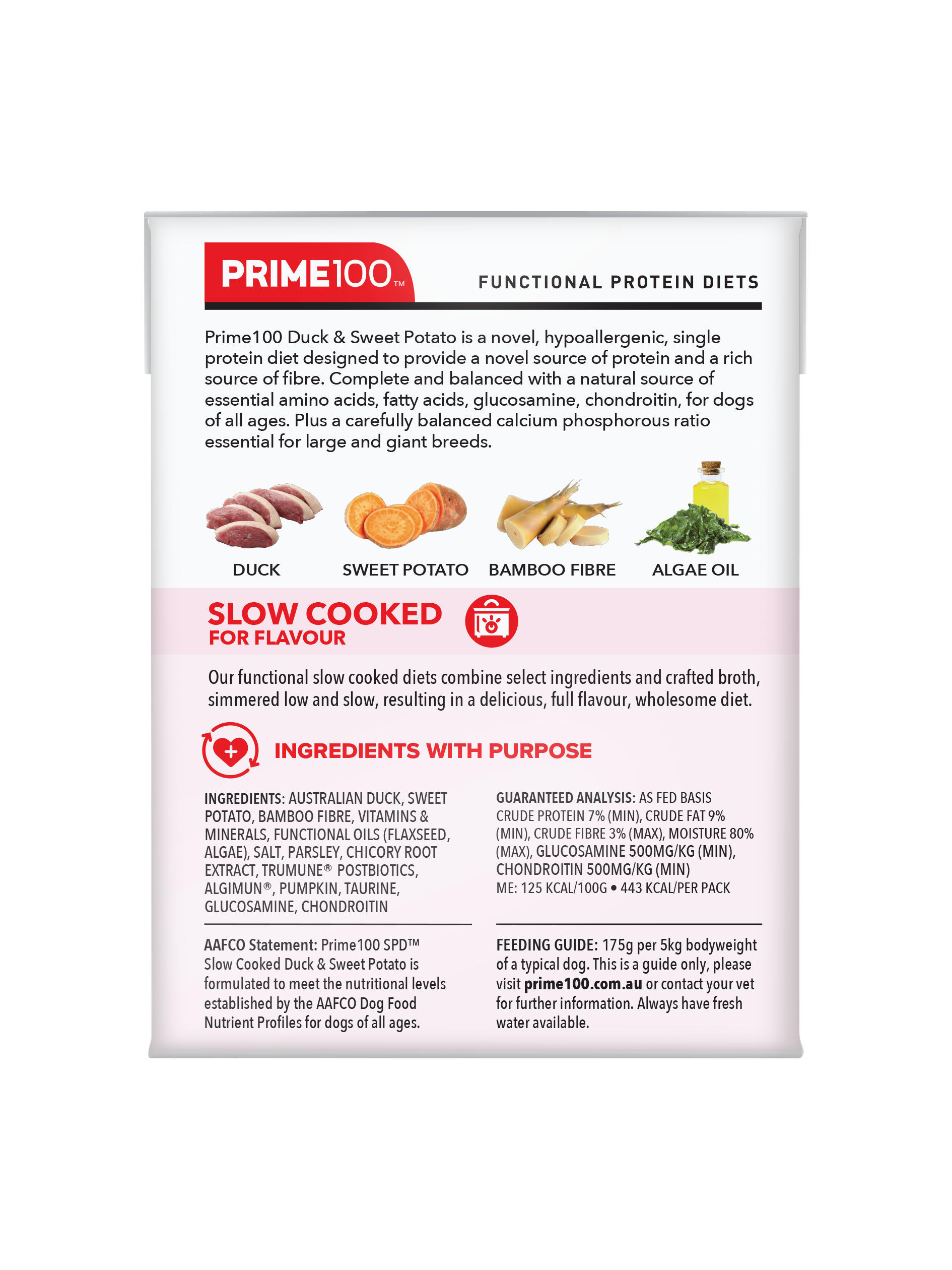 Prime100 SPD Slow Cooked Duck & Sweet Potato is a novel, hypoallergenic, single-protein diet designed for optimal digestion, muscle maintenance, and joint support. Crafted using premium Australian duck and fibre-rich sweet potato, this complete and balanced recipe is suitable for dogs of all ages and breeds, including those requiring a carefully managed calcium-phosphorus ratio for bone development in large and giant breeds.