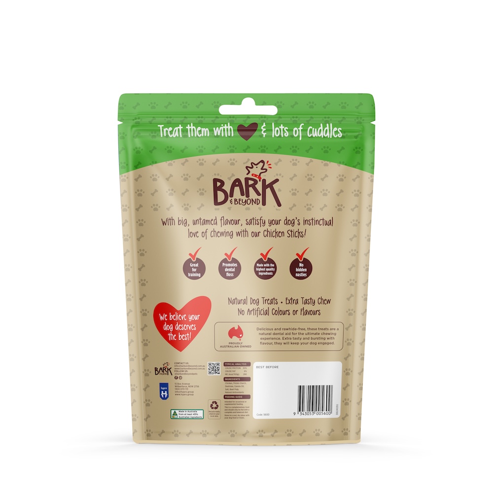 Satisfy your dog’s instinctual love of chewing with Bark & Beyond Chicken Sticks. Made with real chicken and no rawhide, these safe and naturally edible treats will keep your dog happily entertained. Perfect for promoting dental health and freshening breath, these chew sticks offer a big, untamed flavor that your dog will crave.