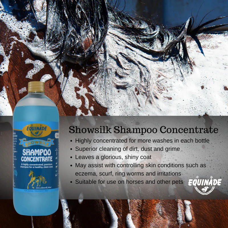 For best results, follow with Equinade Showsilk Protein Conditioner to restore natural pH, add shine and help prevent drying, fading and tangles in manes, tails and longer coats.